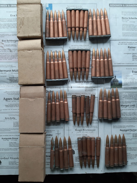 60 S-Patronen, 8x57IS, deutsche Militärfertigung, verkupferte Stahlhülsen, Vollmantel Spitzgeschoss verkupfert, Bleikerne, verschiedene Bodenstempel (meist 1918), 30 auf Ladestreifen, 30 ohne, originale Umverpackungen, Dachbodenfund, keine Funktionsgarantie, Zustand vgl. Bild. Dies ist ein nicht gewerbsmäßiger Verkauf aus Privatbestand, deshalb ist nach §12 Abs.2 BeschG bei nicht CIP-geprüfter Munition ein Erwerb auf Waffenbesitzkarte mit Munitionserwerb-Eintrag oder Jagdschein nur Langwaffenmunition, sowie MES Munitionserwerbschein möglich.