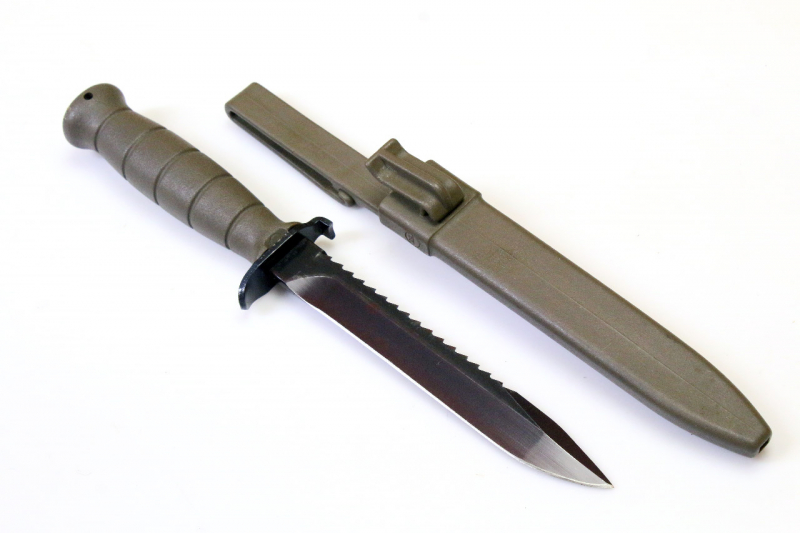 Phosphatierte Clip-Point Klinge, ausgestattet mit einem massiven Sägerücken. Ricasso quartseitig bezeichnet "MADE IN AUSTRIA" über dem Firmenlogo "GLOCK" und der Datierung "81". Der Klingenmaterial HRC-55 Federstahl.