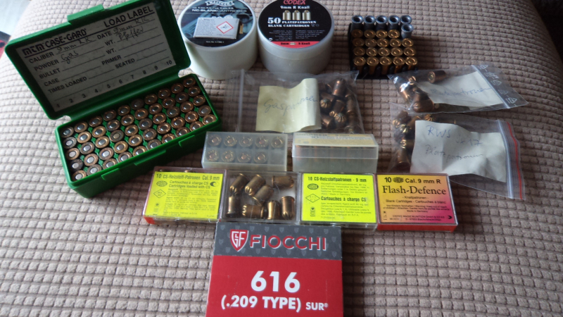 ca. 260 9mm R Patronen gemischt knall, Gas, Pfeffer und 6 Adapter für Zünder Typ 209 u. Zünder 209