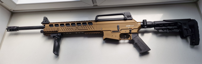 Die Flinte liegt wegen ihres Gewichtes (4 Kg) sehr gut an der Schulter und „tritt“ auch bei schnellen Schussfolgen nicht. Durch die fast rundherum angebrachten Picatynnischienen kann viel Zubehör, u. a. auch Magazine mit Piatynniaufnahme, Handgriff und „Red Dot“ montiert werden. Das „Red Dot“ wird NICHT mitverkauft. Die Flinte hat leichte Gebrauchsspuren, siehe Bilder, ist aber technisch Topfit. Sie lässt sich ohne Werkzeug zerlegen, auch der umlaufende Handschutz lässt sich werkzeuglos entfernen, was zum Reinigen sehr schön ist.