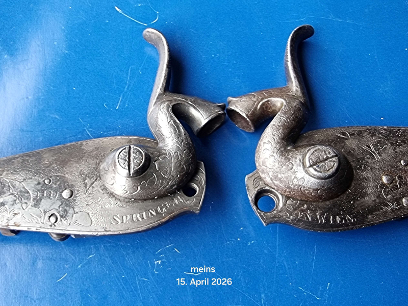 Hab ich so noch nie gesehen. Beim linken Schloss fehlt die Hauptfeder. Wertige Schlösser mit gebrauchs- und altersspuren. Siehe auch Bilder. Altersnachweis ist erforderlich.