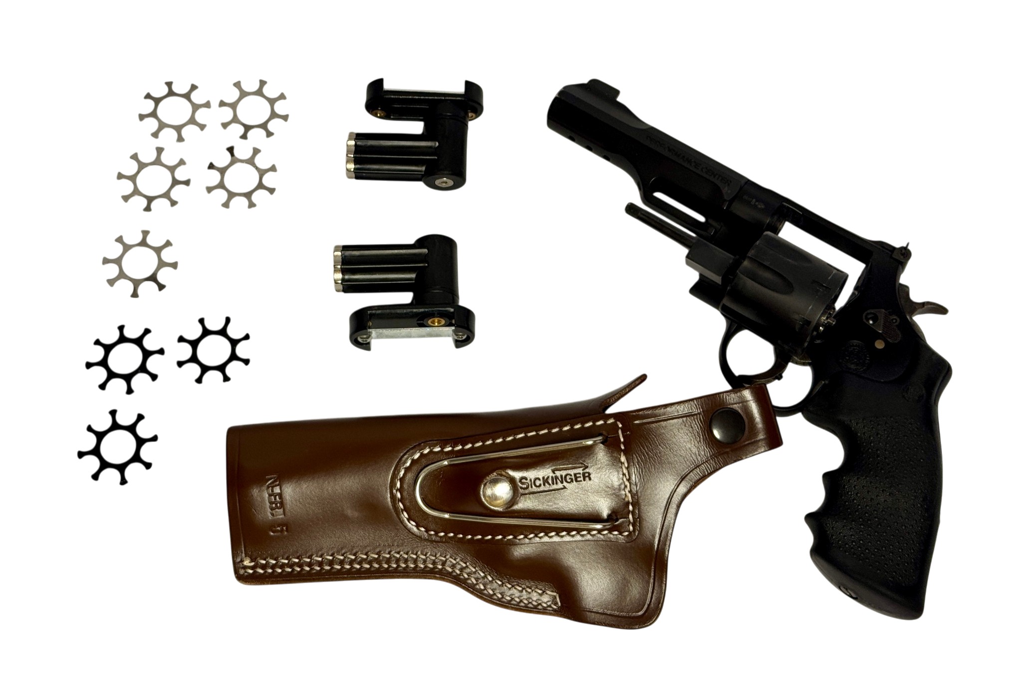 Im Lieferumfang sind neben der Waffeselbst noch die abgeblideten Speedloader inkl. Gürtelklipp und das Sickinger Holster enthalten.