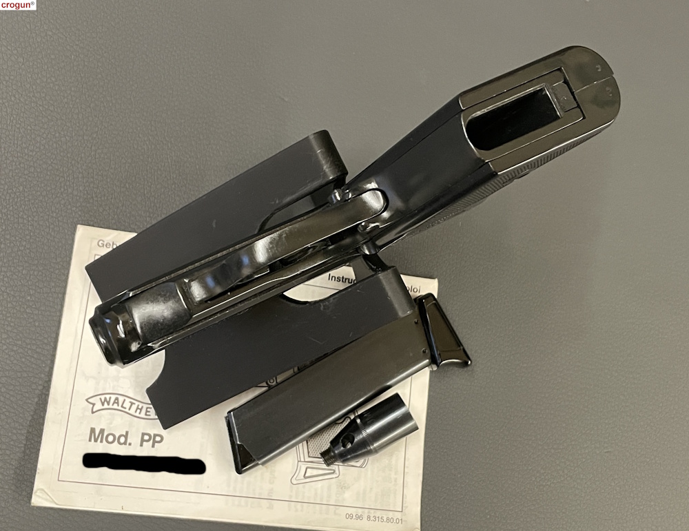 Lieferumfang und Zustand wie abgebildet mit einem Magazin, Bedienungsanleitung (von PP Modell, in Handhabung identisch), Abschussbecher! Bilder zum Teil mit Lichtreflektionen!