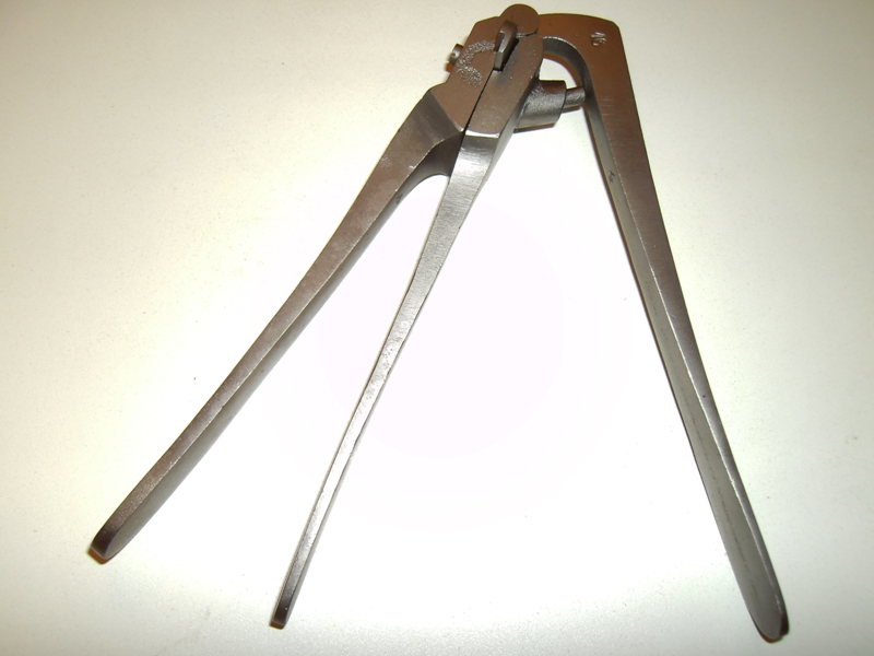Zündhütchenzangen gehörten zu den Wiederladegeräten. Spezialzange aus Metall silberfarben zum Entfernen der gebrauchten Zündhütchen aus Patronenhülsen zur Wiederbefüllung. Zunächst wurde ein Dorn in das Zündhütchen eingepresst, dann der betreffende äußere Arm hoch gedrückt um es aus der Bohrung zu lösen. Hier wurde die Patrone durch einen kleinen Hebel am Patronenrand gehalten. Das Wiederbefüllen von Patronenhülsen, die heute nur noch selten praktiziert wird, war seinerzeit aus Kostengründen bei Privatleuten allgemein üblich. Auf dem großen Hebel der Zange steht 16. Auf der Innenseite aller drei Hebel ist eine 4 eingeprägt. Maße L: 19,0 cm, B. vom 1.-3. Hebel: 15,0 cm, H: 3,8 cm.