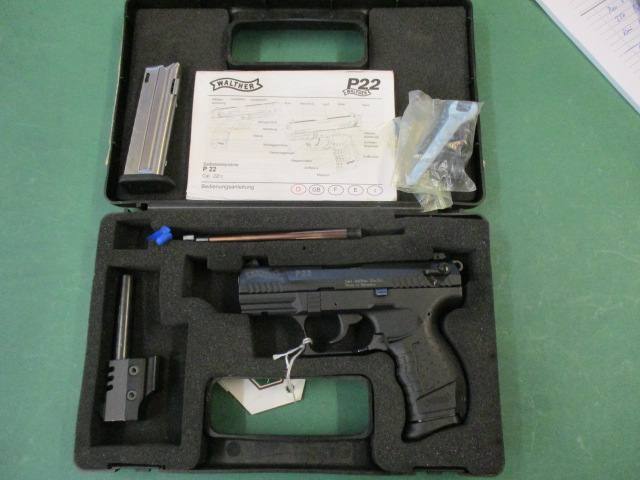 Angeboten wird eine neuwertige KK Pistole Walther P22 im Kal. .22 lr ,komplett mit Zusatz KK Lauf , Gewicht und original Koffer . Versand ins Ausland nur über einen Exporteur .
