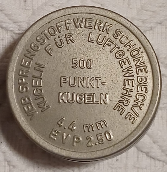 (VEB Sprengstoffwerk Schönebeck). Durchmesser der Kugeln ist 4,4 mm passend zu Magazinen aus Suhl. Es gibt keine Sachmängelhaftung sowie keine Rücknahme oder Umtausch. Versandkosten werden beim Kauf mehrerer Schachteln nur einmal berechnet. Verkauf erfolgt aus Privatbesitz und nur noch wenige Schachteln vorhanden. Also bei Bedarf möglichst schnell zugreifen.