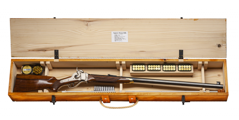Enthält ein Gewehr, eine Holzkiste, 40 Stück Saguaro Hülsen 2,4“ ,50 Stück Geschossen und 1081 Zündhütchen.