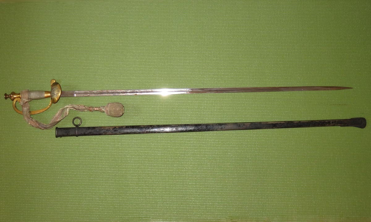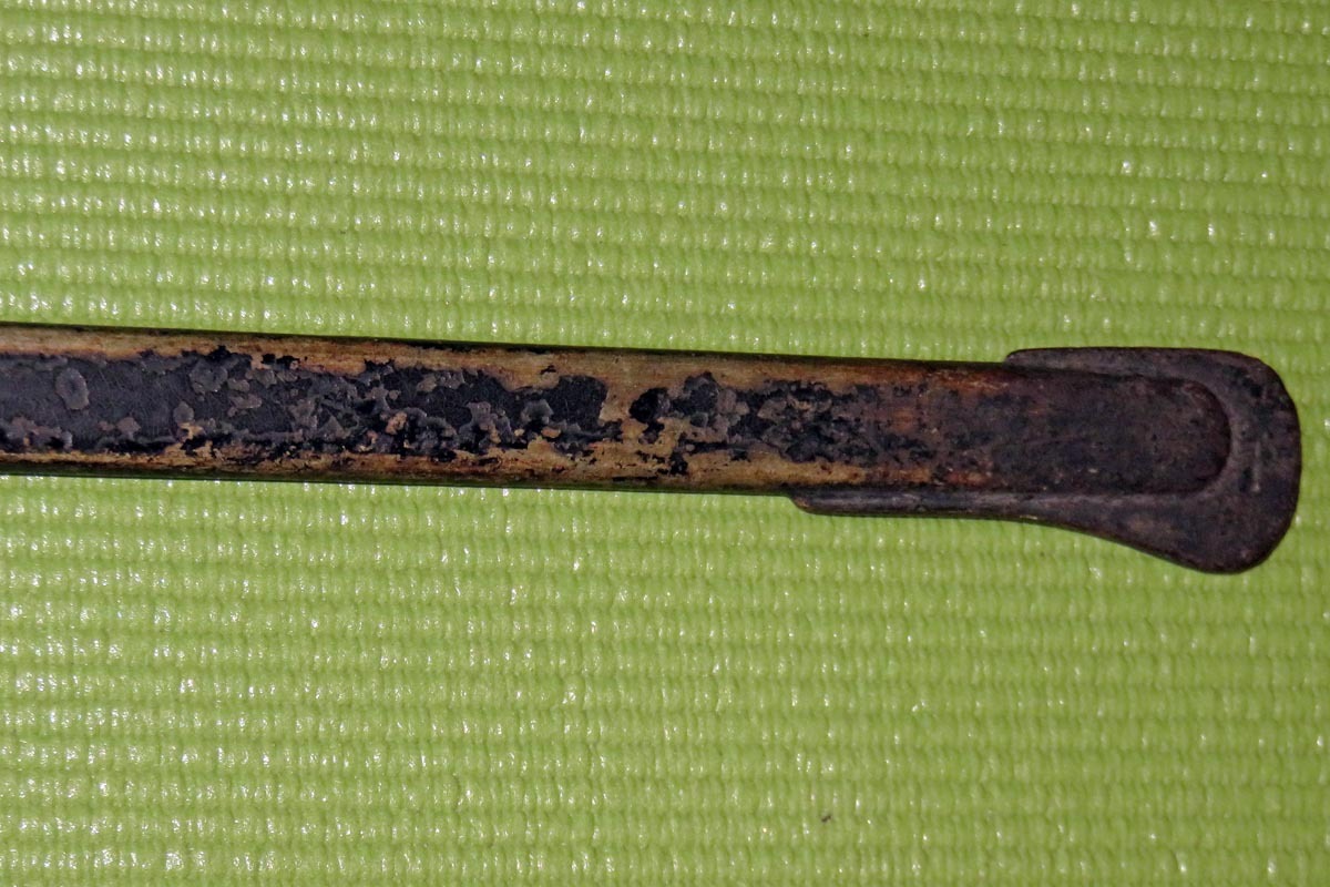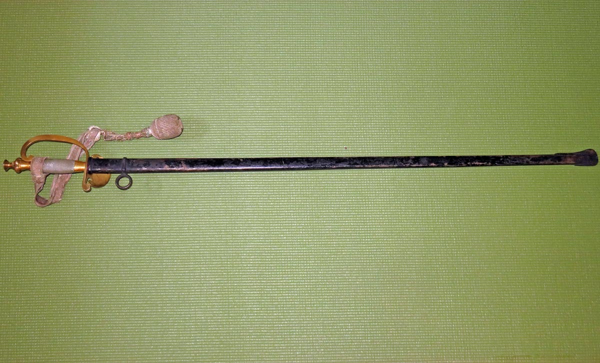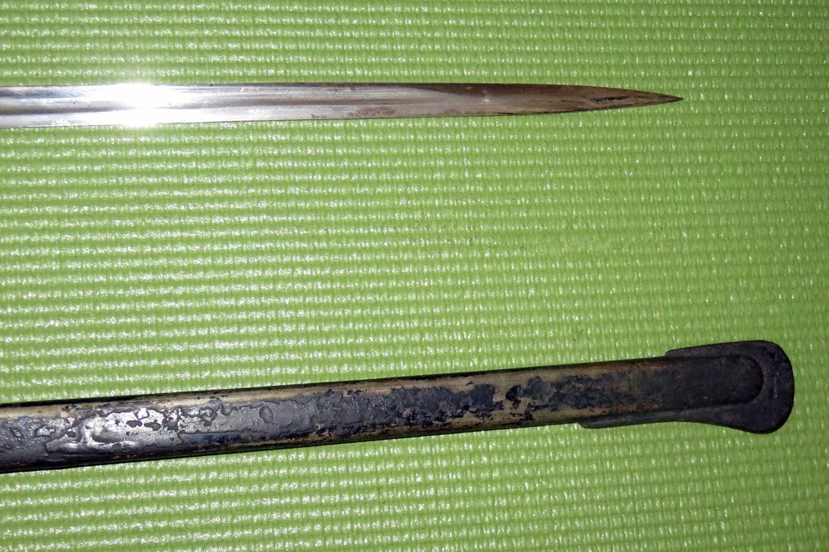 Schönes Sammlerstück mit Gebrauchsspuren im ungeputzten Zustand in einer Gesamtlänge von 95 cm, Klinge ca. 71 cm.