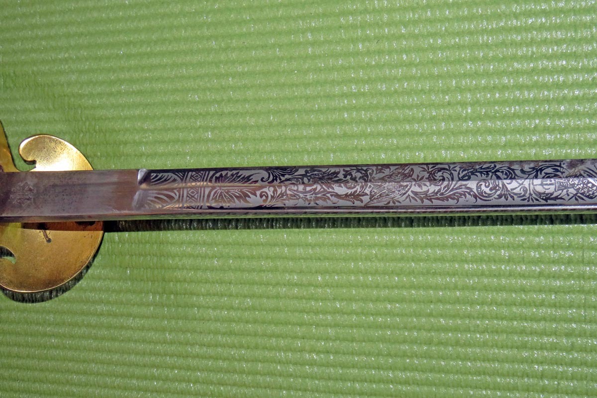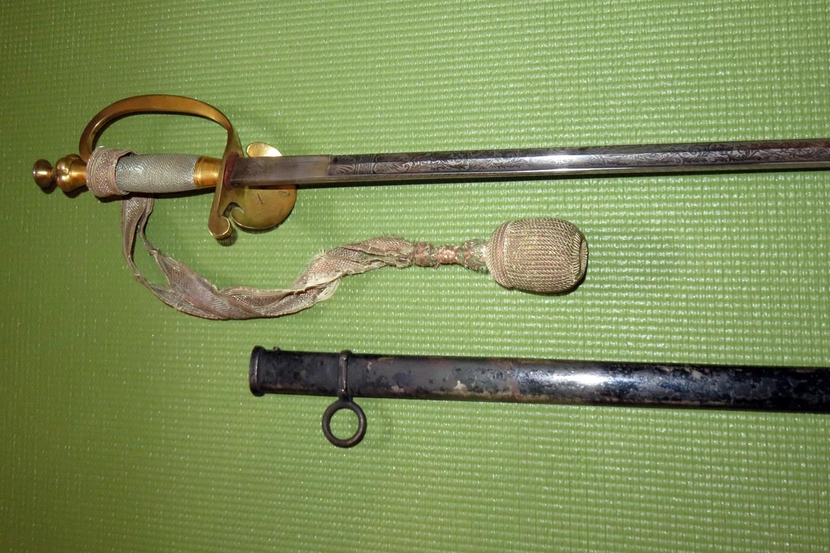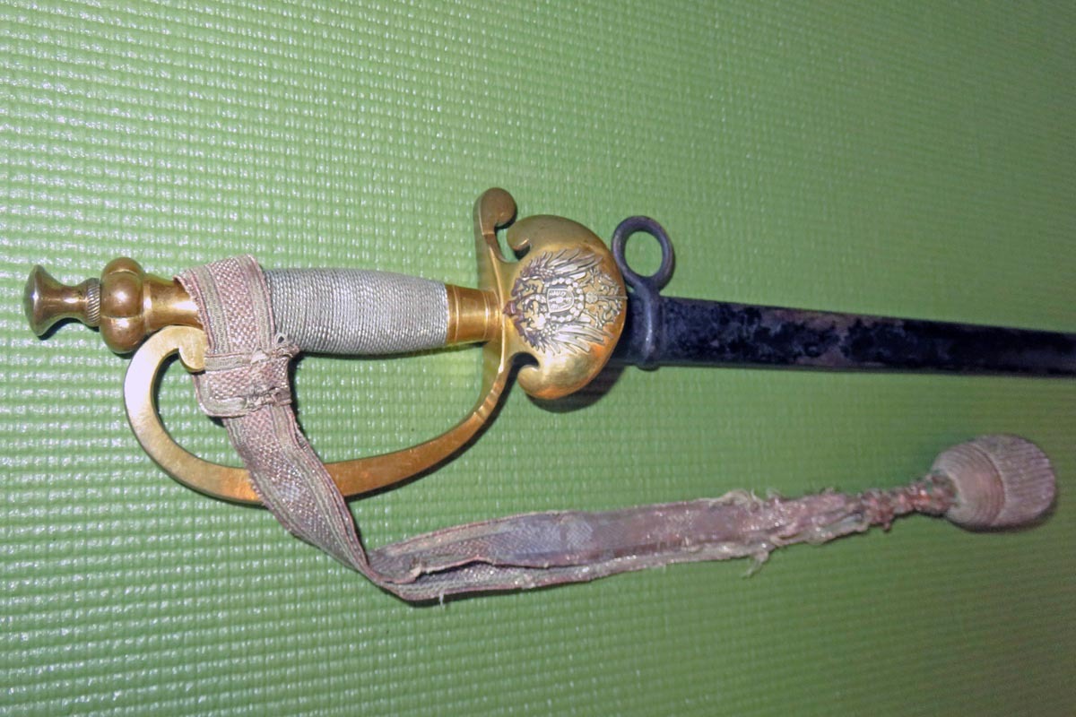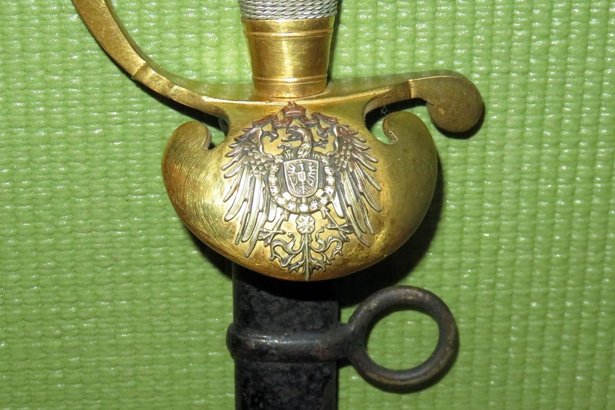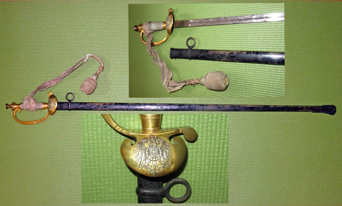 Der Degen mit Portepee ist mit Messinggefäß (leichte Vergoldung noch vorhanden), wobei das Stichblatt eine feine Reichsadlerauflage hat, Griff mit intakter Silberdrahtwicklung.