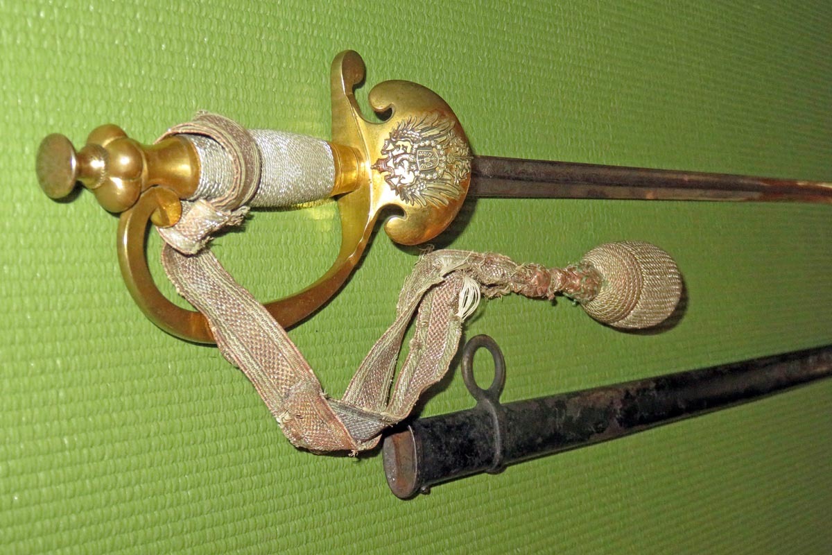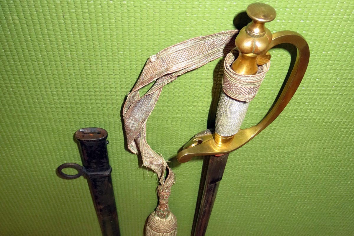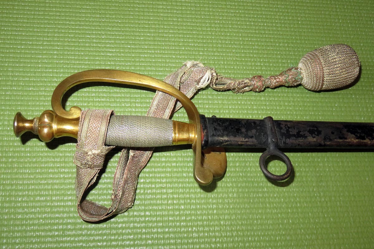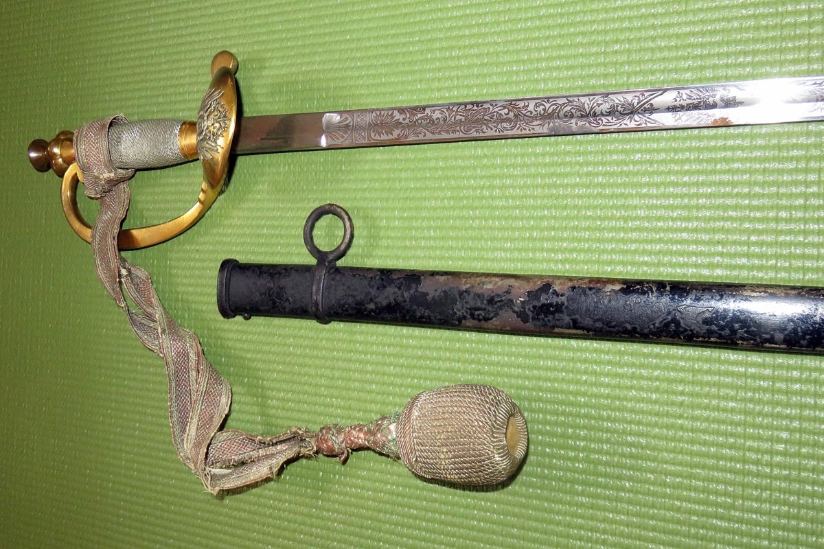 Der Degen mit Portepee ist mit Messinggefäß (leichte Vergoldung noch vorhanden), wobei das Stichblatt eine feine Reichsadlerauflage hat, Griff mit intakter Silberdrahtwicklung.