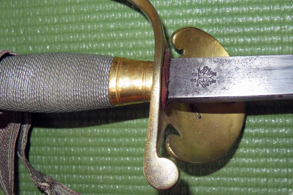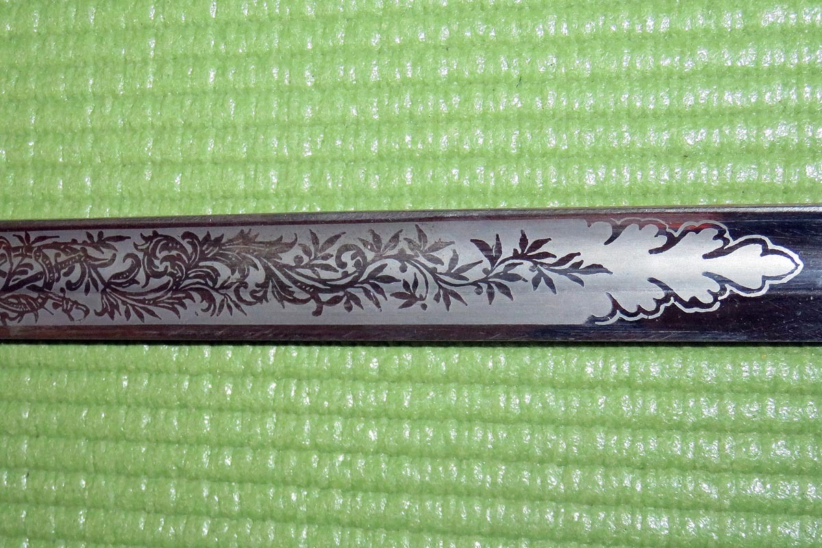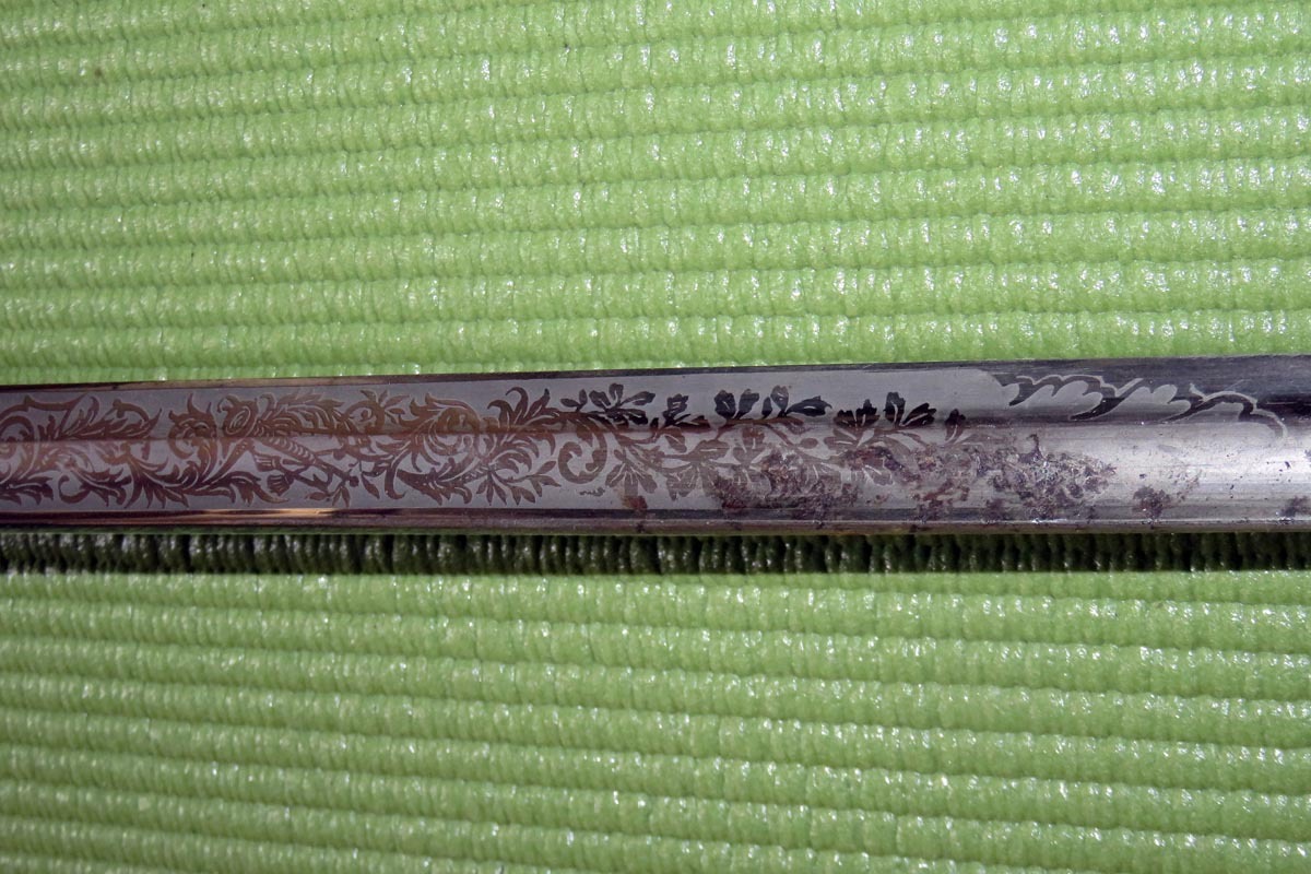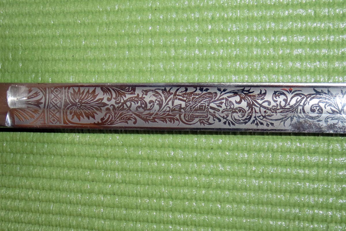 Auf der Klinge ist beidseitig eine reiche Ätzung und eine unbekannte Klingenmarke.