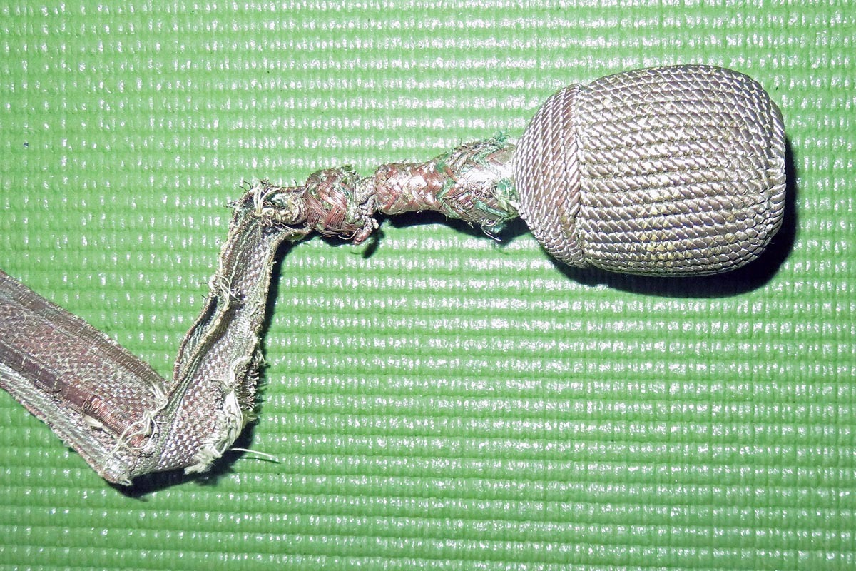 Die schwarze Eisenscheide hat einen festen Ring und ist stark abgenutzt.