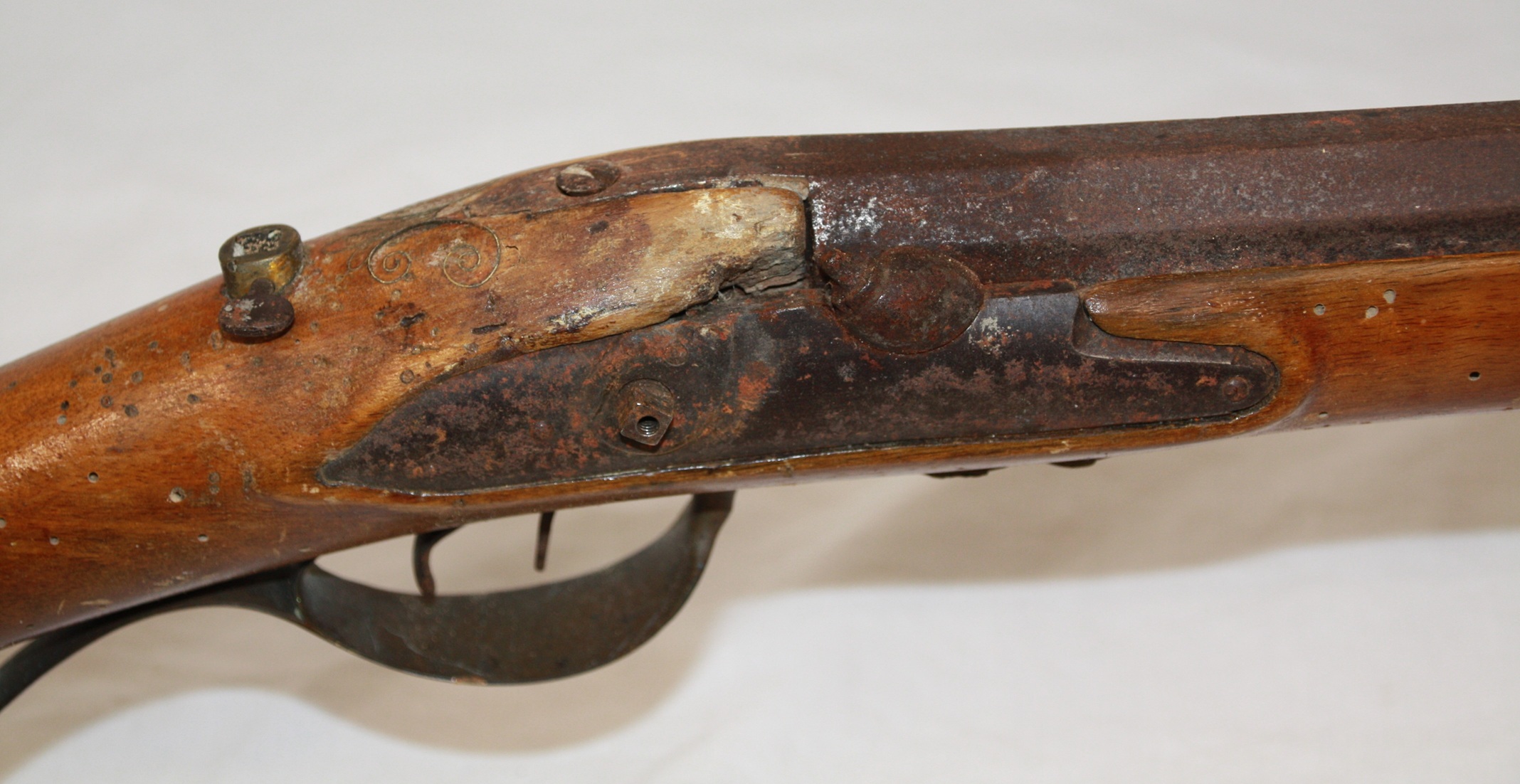 Es fehlt der Hahn und Ferndistanz Visierung. 100% Original. Alterspuren und einige alte Wurmlöcher. Gute Züge.
