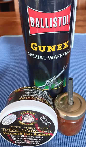 Balistol Spezial-Waffenöl, 400 ml Spraydose unbenutzt, und Lupus Hochleistungsfett (ca. 85 % in der Dose) mit einem Pinsel zum auftragen, abzugeben.
