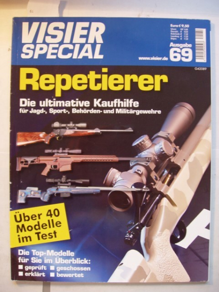 Für Schützen / Waffenfreunde und Waffensammler :+++ angeboten wird das VISIER - SPEZIAL Nr. 69 -- ** Repetierer ** -- Die ultimative Kaufhilfe für Jagd-, Sport- , Behörden- und Militärgewehre +++ Über 40 Modelle im Test -- geprüft -- geschossen -- erklärt -- bewertet ++ Es ist ein Band - mit 114 Seiten - von 2013 +++ Das Heft ist gebraucht, befindet sich aber in einem sehr guten Zustand +++ Der Versand erfolgt als Buchsendung mit DHL (unversichert) ; die Versandkosten gelten nur für Deutschland.+++ Bieter aus dem Ausland bitte Versandkosten vor Gebot erfragen.+++ Versandrabatt möglich, sehen Sie auch meine anderen Angebote.+++ Privatverkauf, daher keine Gewührleistung, Garantie oder Rücknahme.+++ Fragen bitte mailen.