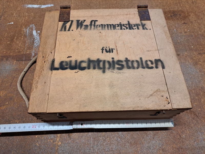Aus Nachlass von meinem Großvater: neuwertige, vermutlich nie ausgegebene Waffenmeisterkiste für Leuchtpistolen der Wehrmacht. Der Seilgriff ist beschädigt und muss repariert werden.