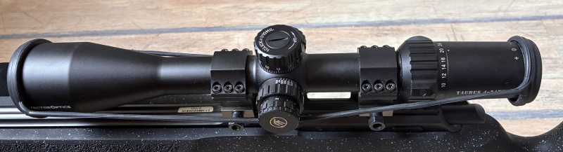Das Zielfernrohr verwendet ein ballistisches Fadenkreuz MPX1, das auf der FFP (First Focal Plane) platziert ist, sodass sich die Absehen-Skala proportional zur Vergrößerung ändert. Taurus verfügt über einen beleuchteten Zielpunkt, der in 6 Leuchtstufen einstellbar ist. Der Wechsel der Beleuchtungsstufen erfolgt über einen Drehknopf an der Seite des Zielfernrohrs – 6 Modi sind verfügbar. Dank der Mehrschicht-Optik (FMC) erhält der Benutzer ein hochwertiges Bild.
