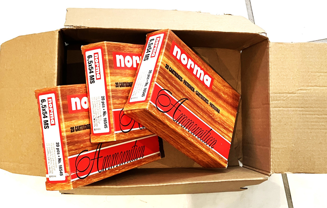 Versteigert wird die abgebildete originalverpackte Norma Jagd-Munition in 6,5x54 Mannlich-Schönauer (60 Schuss)