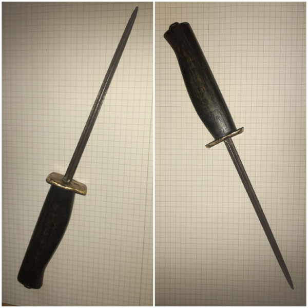 Messer mit Vierkant bzw.Kreuzklinge,Parierstange aus Messing, Griff aus Holz.Gesamtlänge ca.26,5 cm.