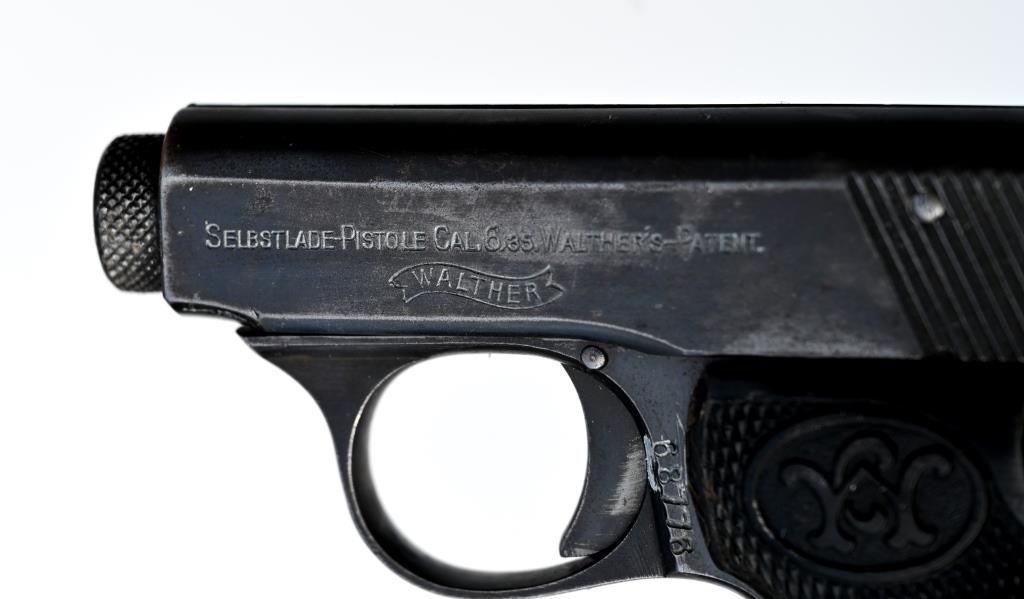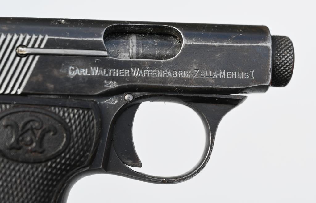 Auf Schlitten rechts Herstellerangabe "Waffenfabrik Walther Zella-Mehlis I" und gültiges altes Beschusszeichen Krone über N. Letzteres auch auf Lauf und Griffstück rechts. "SELBSTLADE-PISTOLE CAL. 6,35. WALTHER`S PATENT" und Walther-Schleife links auf dem Schlitten. Links auf dem Griffstück Seriennummer. Schwarze Kunststoffgriffschalen geprägt "CW" (= Carl Walther), mit leichten Gebrauchsspuren. Beidseits der Sicherung "S" bzw. "F".