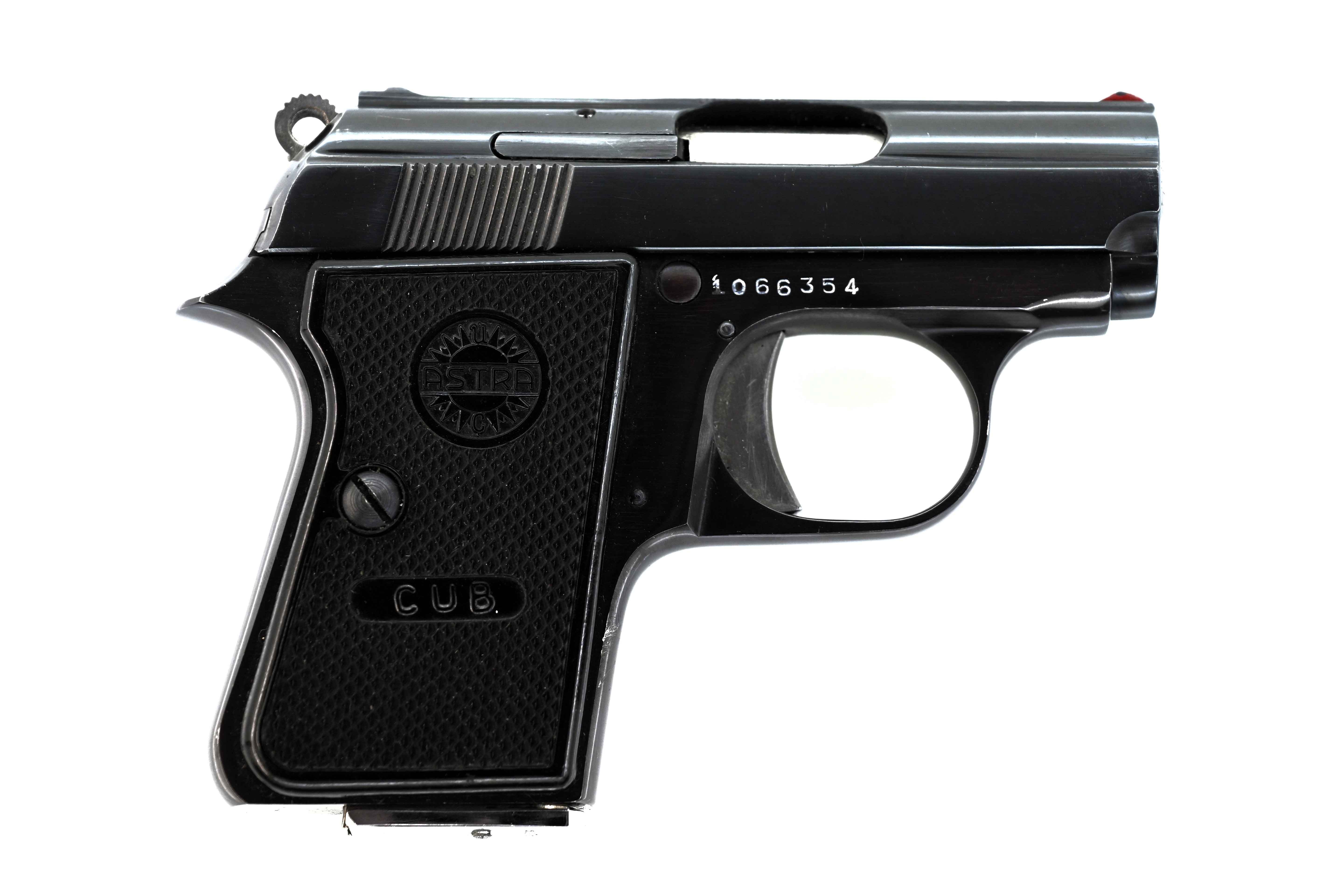 Kaliberangabe "CAL. 6,35 (.25)“ auf dem Schlitten links, gültiger spanischer Beschuss, Hersteller „ASTRA Unceta CIA-Guernica - SPAIN", diverse gültige spanische Beschusszeichen "P" auf dem Rahmen, unter der linken Griffschale, codiert-datiert "R*1" = 1973. Seriennummer "1286716". Kreisrundes Firmenlogo "ASTRA" und Modellbezeichnung "CUB" auf beiden Griffschalen. Magazinboden geprägt "ASTRA".