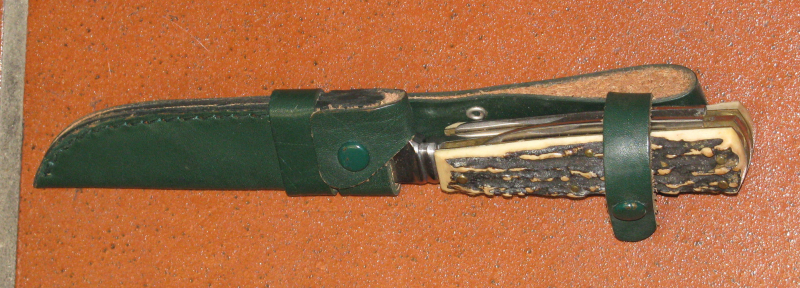 Zum Verkauf kommt ein Interessantes Jagdmesser mit Werkzeug im Griff und Horngriffschalen / Lederscheide