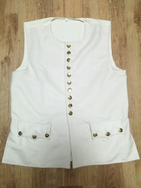 Lange Weste Gr XL wie sie ab ca 1730 in Mode kam und wie sie zu Uniformen aber auch als Zivilkleidung noch lange getragen wurde . weiche , nichtkratzende Wolle , 2 große Taschen , Futter aus feinem , luftigem Canvas , Rohweiß , 2 Seitenschlitze , Metallknöpfe , Brust / Bauch 122 cm , Länge 80 cm , Bestandsauflösung da der Schuhnagel.de schließt