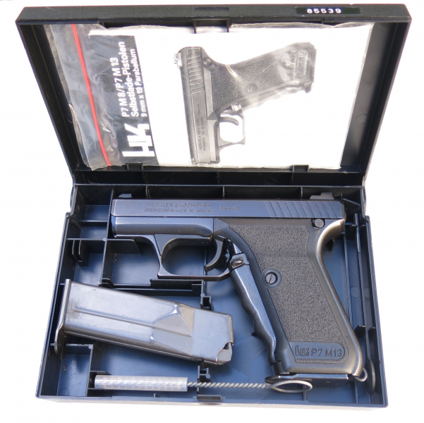 Zum Verkauf steht eine gebrauchte P7M13 aus BDS-Sportschützenbestand. Die Pistole wurde von mir 1993 (Kodierung KD) für das Großkaliberschießen erworben und befindet sich in der nummerngleichen Originalkiste. Darin befindet sich noch das komplette Zubehör, wie Reservemagazin, der Bedienungsanleitung, dem Schussbild, einer Bürste für den Gaszylinder und dem Reinigungswerkzeug. Sie wurde vor einigen Jahren bei Heckler & Koch im Werk überprüft und generalüberholt. Dabei wurden die Verschleißteile wie Federn, der Gaskolben und die Schließfeder erneuert. Seitdem lag die Pistole nur im Schrank und wurde nicht mehr geschossen.