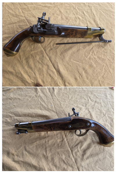 Eine in Spanien gefertigte Steinschloßpistole mit Vollschäftung – Nußholzschaft mit Maserung. Umklappbarer gelenkgearbeiteter Ladestock. Beschläge in Messing, der Laufabschluß in doppelt geformter Messingummantelung. Das Schloß in besonders schwerer Ausführung mit Gravuren. Die Waffe wurde 1968 gefertigt nach vorliegendem Originalstück (in allen Teilen identisch). Eine sehr schöne aber auch schwere Steinschloßpistole.