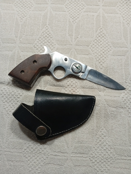 Biete aus einer Sammlung ein Klappmesser in Revolverform an. Dazu gehören ein Lederholster mit Gürtelclip. Das Messer ist insgesamt 18 cm lang. Die Klinge ist 6 cm. Die Griffschalen sind aus Holz. Durch ziehen am Revolverhahn lässt sich das Messer zusammenklappen.