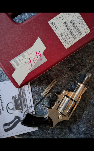 Signal Revolver Uma Lady Gold Kaliber .380 Knall in gebrauchtem Zustand. Mit Schwenktrommel und einschraubaren Zusatzlauf für Signalsterne. Double Action Revolver mit der alten PTB 486. Noch echte Made in West Germany Qualität. Die Trommel fasst sechs Kartuschen. Kleine Laufsperre, lässt sich gut reinigen. Ich habe damit nicht geschossen. Single Action Funktion ist gegeben. Beim Double Action klemmt die Trommel. Oberfläche ist noch recht schön, Schmauchspuren an der Laufwurzel / Rahmen. Sieht nach all den Jahren noch recht gut aus. Anleitung, Bürste, Becher und Box.