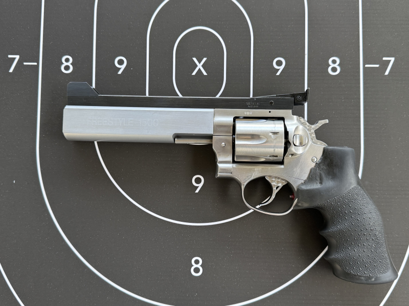 Ruger GP Revolver 357 mag, für den Wettkampf PPC 1500 von Frankonia gebaut, verschossen wurden 38iger Wadcutter im Lothar Walter Polygon Matchlauf. Schussleistung auf 50 Meter 12 Schuss aufgelegt mit Red Dot 38 mm Streukreis. Aristocrat 3 Stellungsvisier mit grünen Lichtsammlerkorn 1mm Durchmesser und hohen Kornflanken. Houge Gummigriff im Bereich der ausgeschwenkten Trommel etwas ausgeschnitten, zum besseren einstecken der Speedloader. Trommelbohrungen angefast. Der Rugergriff auf dem 50 Meter Schussbild ist Bestandteil der Auktion. Privatauktion keine Gewährleistung und Rücknahme. Die Versandkosten sind erst einmal so angenommen, genaue Kosten von zertifizierter Waffenspedition ist nach Verkauf zu definieren. Da ich diesen Revolver auch noch anderweitig anbiete, behalte ich mir vor, die Aution auch ohne Angaben von Gründen vorzeitig beenden zu können. Internationaler Versand möglich, der Käufer muss sich selbst um die Händler kümmern die berechtigt für diesen Handel sind.