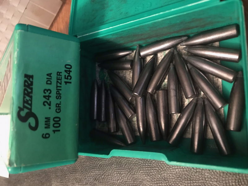 Von Privat : ca 125 Geschosse Sierra Spitzer Teilmantel Nr 1540 - .243 Diam./ 6mm - 100gr, eine Packung noch versiegelt, die restlichen 25 Geschosse wurden mal beschichtet - siehe Bild - Von Privat, daher keine Garantie oder Rücknahme - Versandpauschale 6 Euro - ins Ausland mehr, evtl bitte Anfragen
