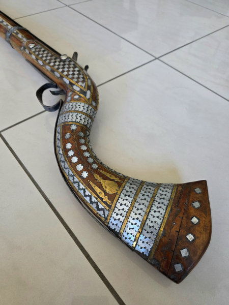 Steinschlossgewehr Orient/Afghanistan mit Intarsien. Sehr groß, Länge 1,75m. Kal. vermutlich 16mm. Zustand: minimale Fehlstellen in den Intarsien. Zwei Schrauben ersetzt. Steinhalter fehlt. 1850. Verkauf nur ab 18 Jahren! Damit ich rechtlich abgesichert bin: Dies ist ein Privatverkauf. Die Haftung aufgrund von Arglist und Vorsatz sowie für Schadensersatz wegen Verletzungen von Körper, Leben oder Gesundheit sowie bei grober Fahrlässigkeit oder Vorsatz bleibt unberührt. Bei Artikeln ab 18 Jahren muss ein amtlicher Alternsnachweis vom Käufer bereitgestellt werden.