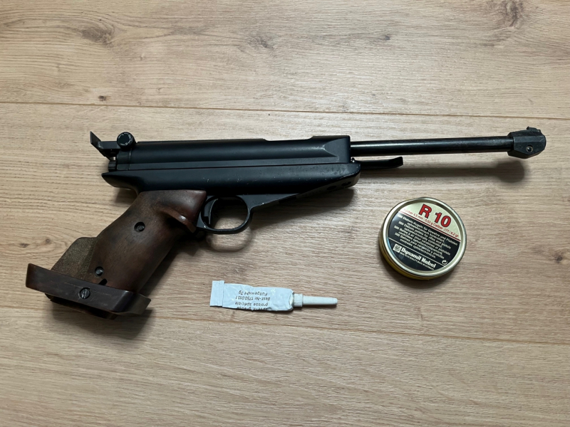 Die Luftpistole ist gebraucht, mit entsprechenden Gebrauchsspuren, ohne Einfluss auf Funktion oder Leistung. Mechanisch einwandfrei, sauberer Abzug, Zustand siehe Bilder. Mit dabei ist eine fast volle Schachtel Diabolos und eine Restmenge Fett von Feinwerkbau sowie ein einfaches Futteral.