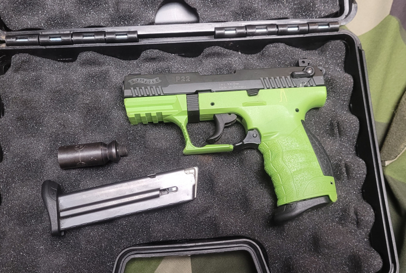 Hier eine Walther P22Q Zombster, leider mit einem Verschluss der normalen P22, der originale ist mal gerissen.