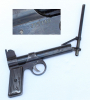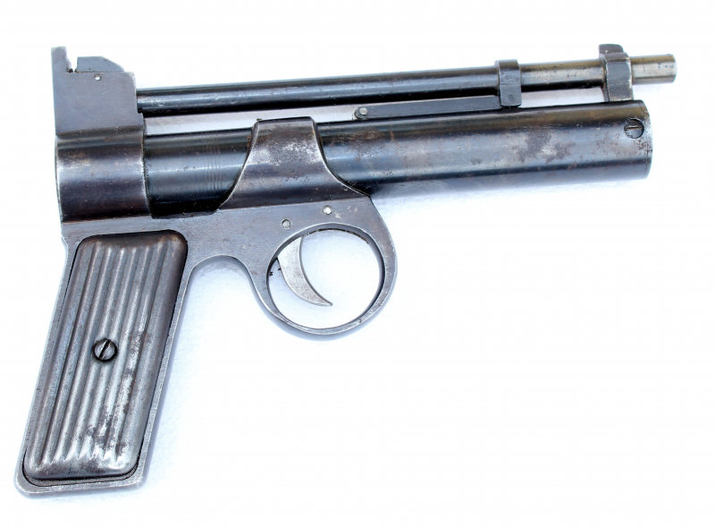 Ab 1929 begann die Produktion des kleineren Modells Junior. Laut Seriennummer wurde diese abgebildete Pistole ca. 1933 hergestellt. Die blechgeprägten Griffschalen sind ein Erkennungsmerkmal. Die Kimme ist nicht verstellbar. Der Lauf ist etwas länger als bei späteren Junior-Modellen. Die Kolbendichtung bestand noch aus Leder. Die Fertigung dieses Modells endete ca. 1938.