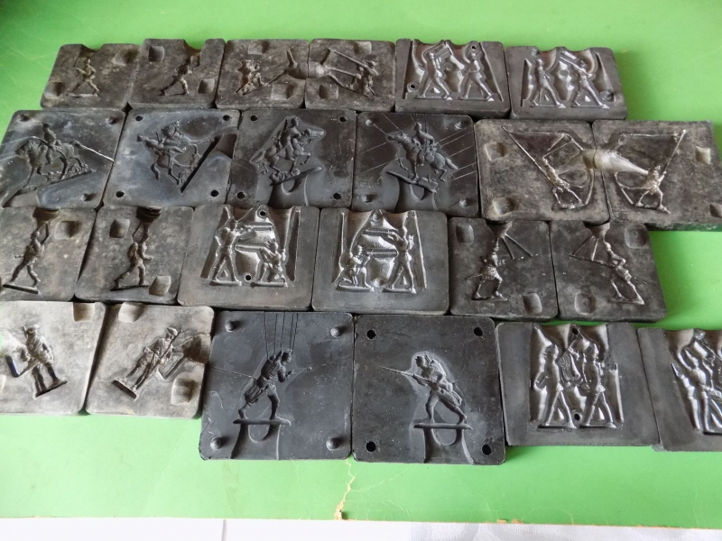12 verschiedene Formen für Zinnsoldaten, Reiter, Fahnenträger usw. Mit einem Buch für Farbvorlagen, Klammern, Gießkelle und Schiene fürs bemalen.
