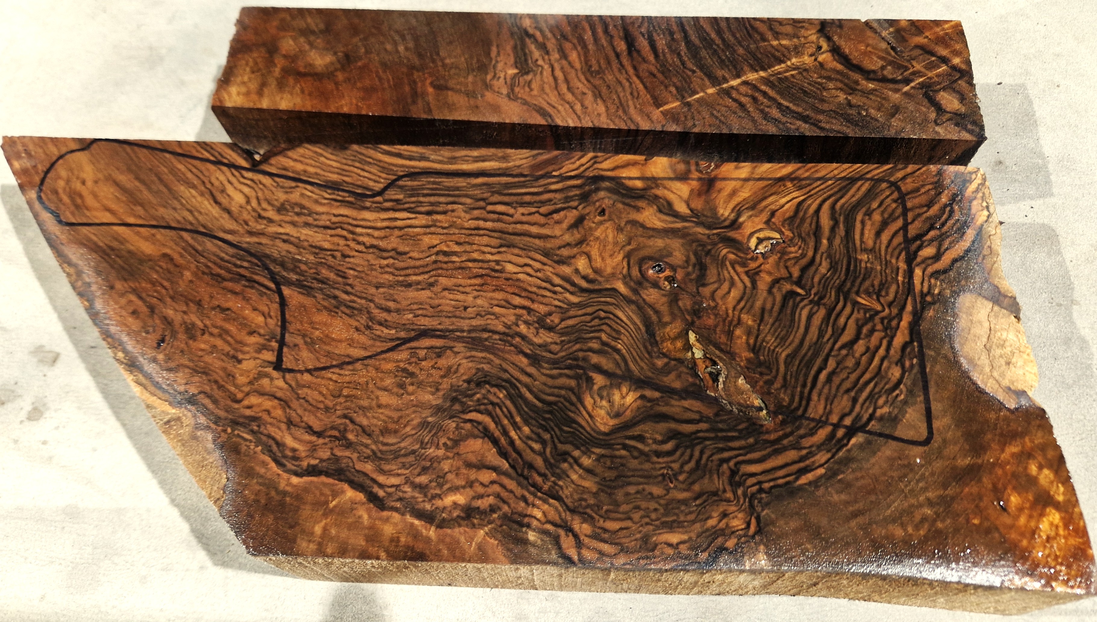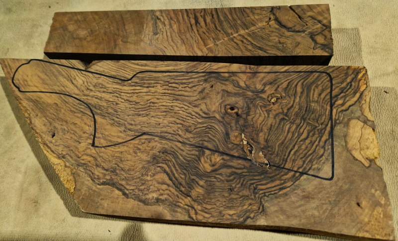 Die ersten Aufnahmen entstanden auf einem leicht angefeuchteten Holzbrett, um die Farben und die Schönheit des fertigen Produkts realistischer darzustellen. Das letzte Bild zeigt die Maße in Zentimetern. Die Konturen wurden auf die tatsächlichen Abmessungen der Blaser F3 übertragen. Die Teile wurden fünf Jahre lang luftgetrocknet. Auf Dampftrocknung wurde verzichtet, um die Farben und die natürlichen Harze des Holzes zu erhalten. Das Ergebnis ist ein elastischerer, festerer und schönerer Schaft