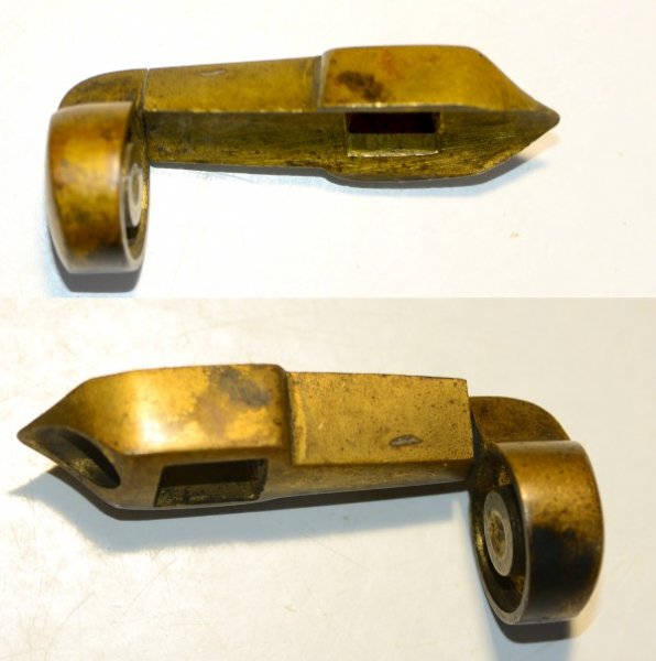 Unbekannter Mündungsschoner aus Messing, er wird über das Korn gesteckt und die Mündungskappe wird dann vor die Mündung gedreht, für ein Gewehrkaliber von 10-11 mm, Abstand Kornvorderkante zu Mündung ca. 27mm, Kornsockellänge 10mm/Breite 9mm, um 1870 oder davor