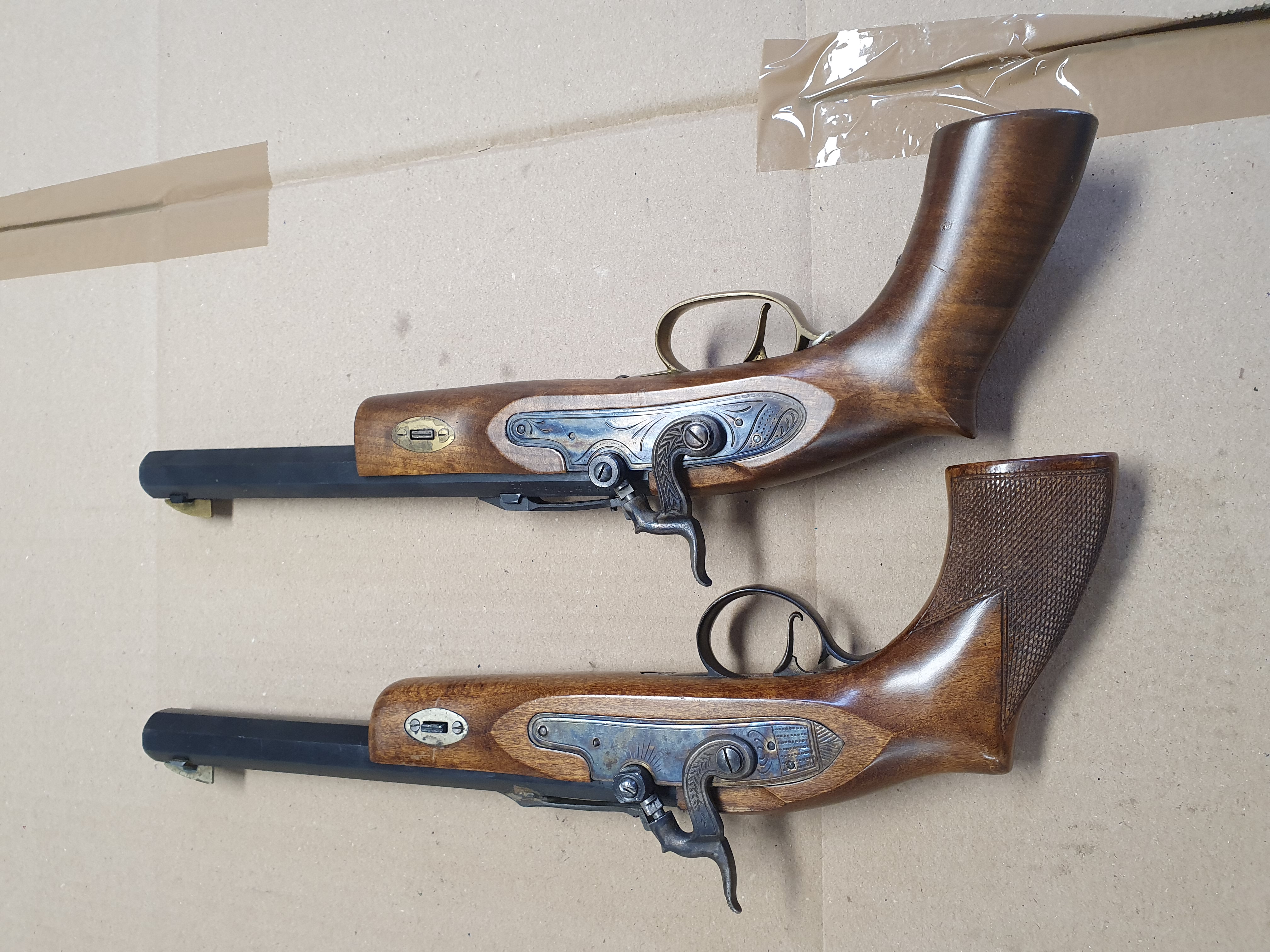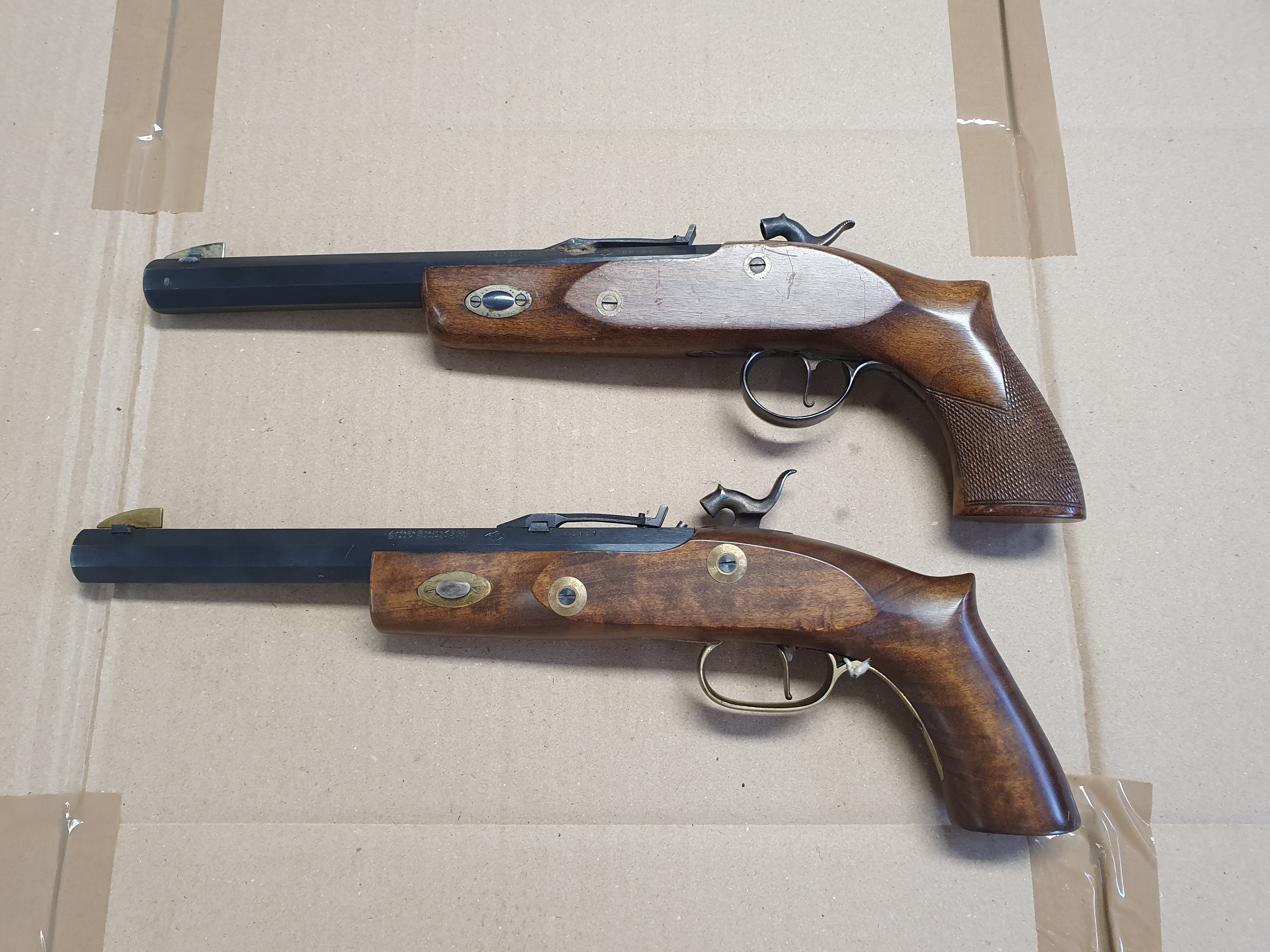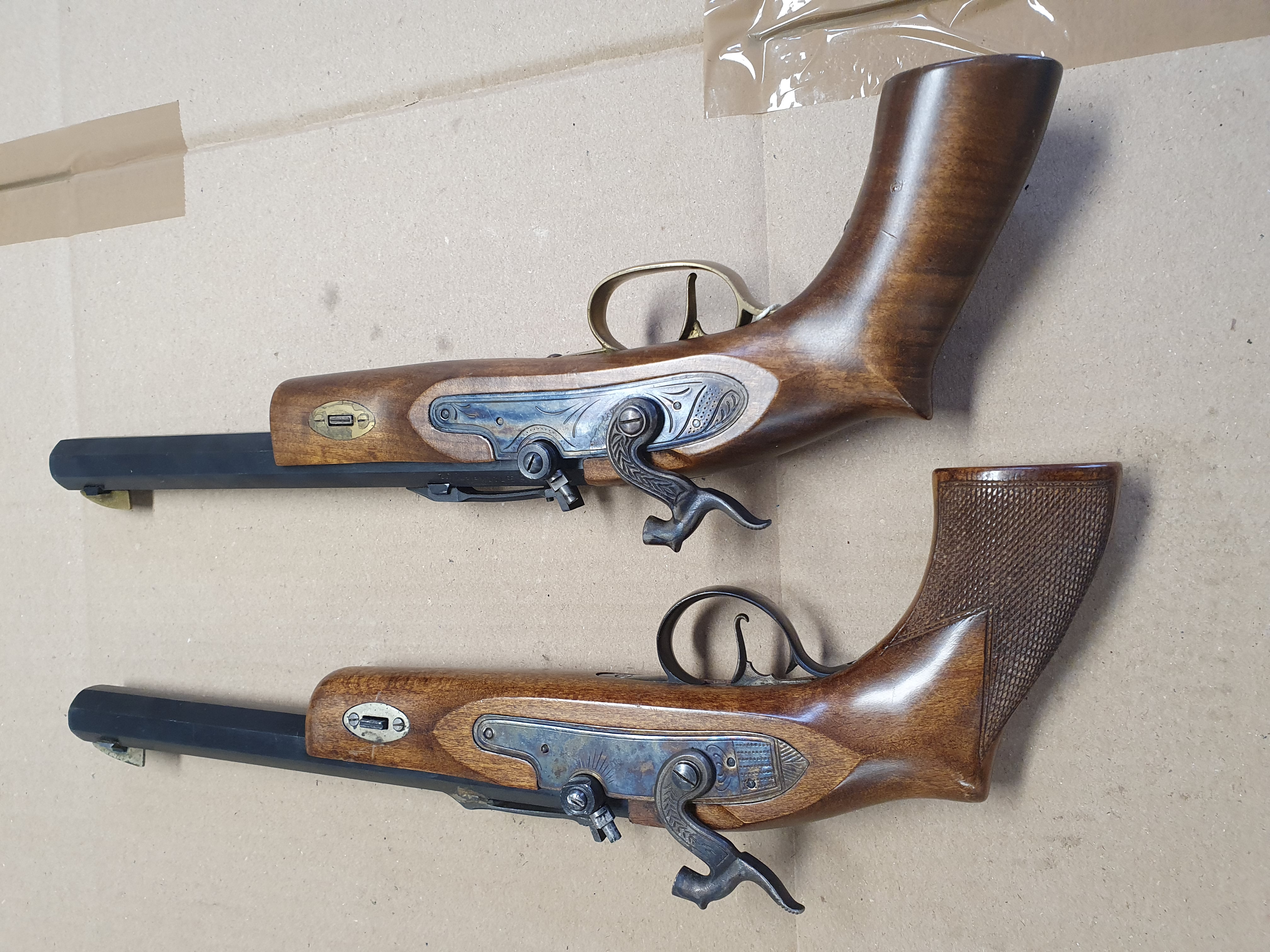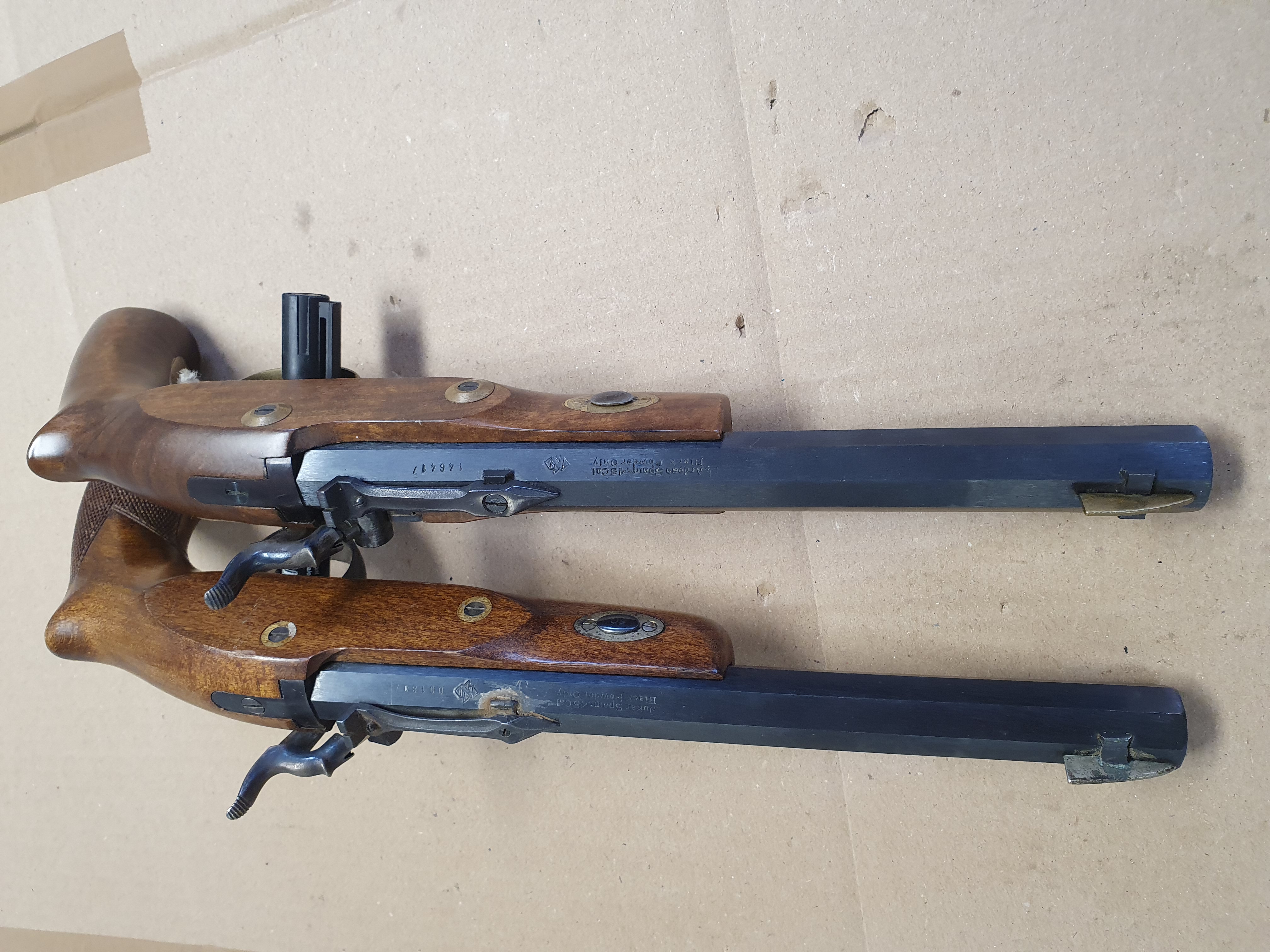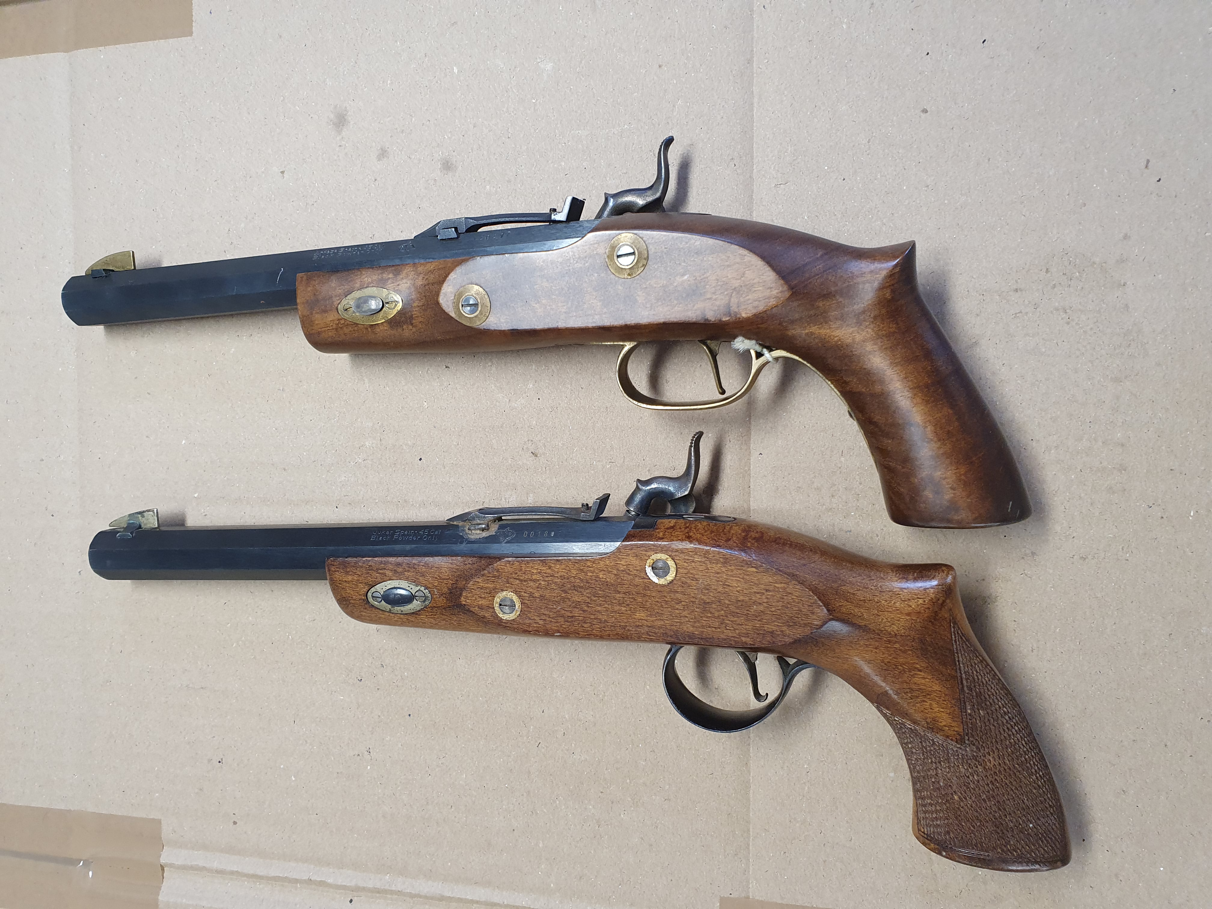 Zwei Stück Schwarzpulver Vorderlader Pistolen cal .45 Black Powder Only. Verschiedene Hersteller.