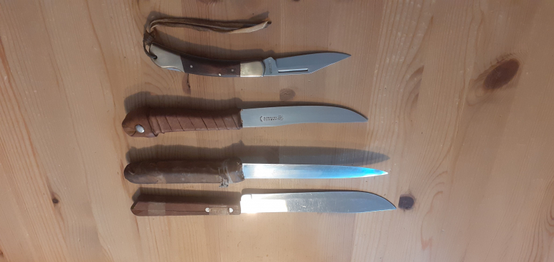 Das kleinste Messer ist ca. 19 cm lang, das größte Messer ca. 30 cm, natürlich mit Gebrauchsspuren.