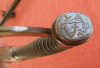 Alter Degen Pallasch Eigentumsstück beidseitig auf der Klinge Inschrift in Treue Fest.Klinge ohne Hersteller personalisiert mit Datum 23.12.1899 Namen und am Knauf Gravur Nameskürzel.Gesamtlänge mit scheid 100 cm.Klingenlänge 84 cm.,maximale Breite der Klinge 1,9 cm..Die Klinge selbst kaum rostig dafür einige nicht tief gehende kerben hauptsächlich im vorderen Bereich siehe dazu auch Detailfoto.Scheide recht ordentlich erhalten zum Ort vorne beidseitig kleine Beule.Hänger Schleppriemen aus Leder auch noch dabei.Wicklung fest Rochenhautgriff in Ordnung,sieh auch die Bilder die zum verkauf gehören.Privatverkauf keine Garantie und Rücknahme da gebrauchter Gegenstand.Versand über DHL zu 12 € innerhalb Deutschland trägt Käufer......KEIN VERSAND INS AUSLAND.