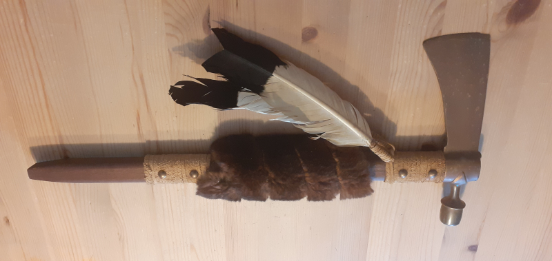 Obiger Tomahawk hat eine Länge von ca. 48 cm, mit Fell verziert. (das Fell ist vorne beschädigt).