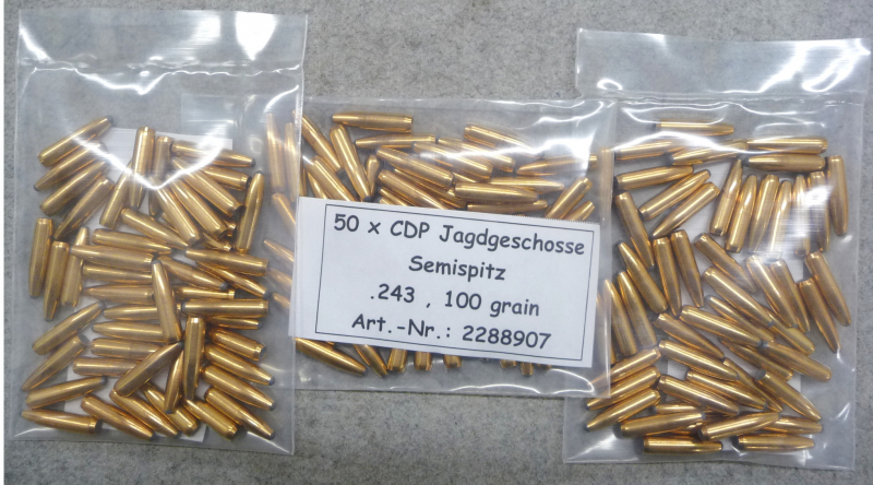 Hier werden 150 Blaser CDP Geschosse, .243 Dia., 6,5 Gramm, bzw. 100 grain, Teilmantel angeboten.