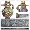 Überaus reichhaltig verzierter Hirschfänger aus dem frühen 18. Jahrhundert. Das Messing-Bügelgefäss ist reliefartig bedeckt mit Monsterköpfen und Blattwerk. Auf dem Stichblatt haben sich drei Hunde in einen Wolf verbissen. Das Kreustück aussen zeigt einen Hund und innen einen Hirsch. Gerillte Hirschhorn-Griff mit vier Lagen verdrillter Messingdraht-Wicklung. Halbkugelige Griffkappe mit Blattwerk überzogen. Abweichend von den üblichen Jagdmotiven ist die Klinge auf beiden Seiten geätzt mit einer Art sitzender Gottheit, die Arme und Beine gekreuzt hat. Eingerahmt wird das Ganze von tempelartigen Säulen und Mauerwerk.