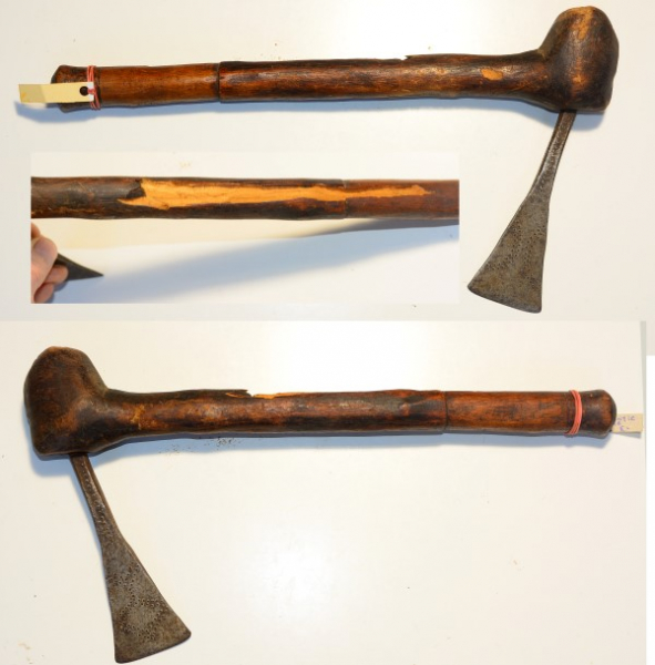 Afrikanische Beil, Eisenklinge mit Holzstiel, der Stiel ist 34cm lang und die Klinge 12,5 cm, oben am Stiel alter Holzwurmschaden