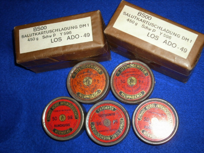 Zur Dekoration oder Sonstiges 5 leere Blechdosen 9 mm Flobert , und 2 Pakete Salutpulver in Oelpapier ohne Inhalt , guter Zustand