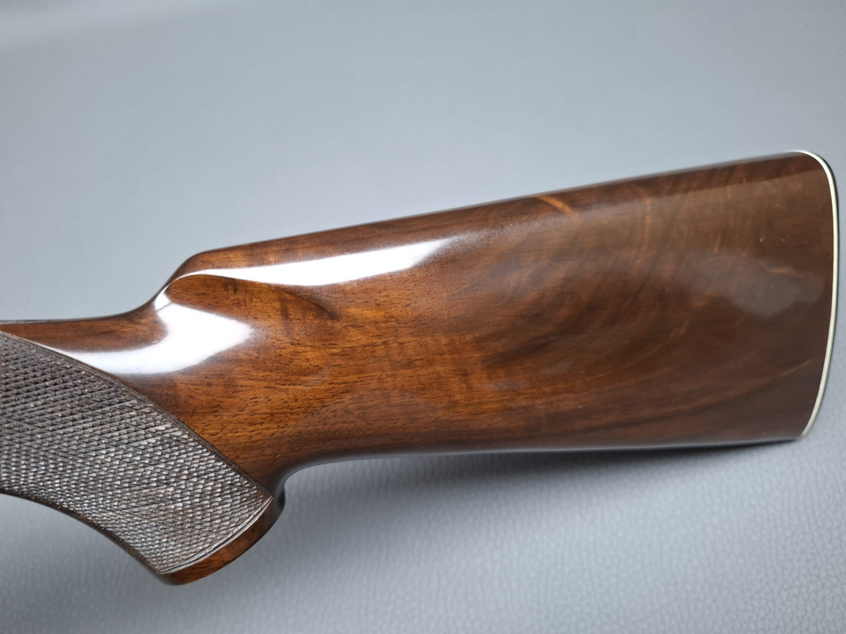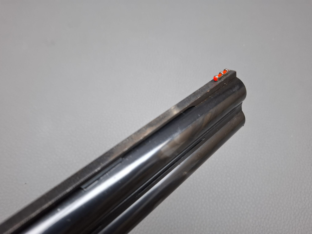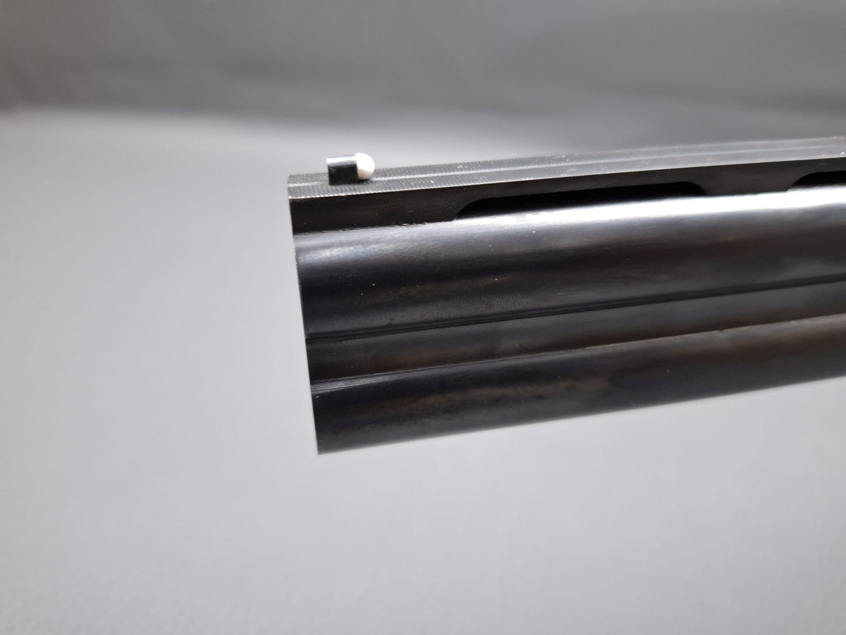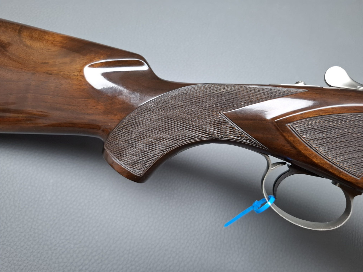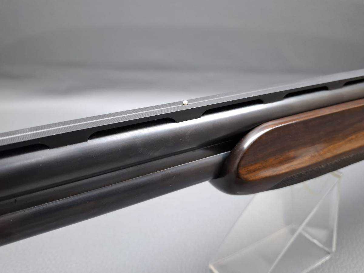 breite ventilierte Laufschiene, helles Perlkorn und Hilfskorn, Ejektoren, Einabzug mit Umschalter, Stahlabzugsbügel, Sicherungsschieber auf dem Kolbenhals. Nußbaumschaft ohne Backe und ohne Schränkung, für Rechts- und Linksschützen geeignet Läufe sehr gut, Verschluß dicht, leichte Gebrauchsspuren, Brünierung 97% Gebrauchtwaffe sehr gut