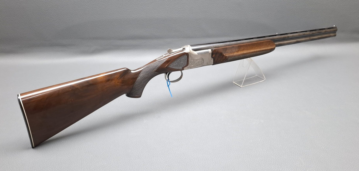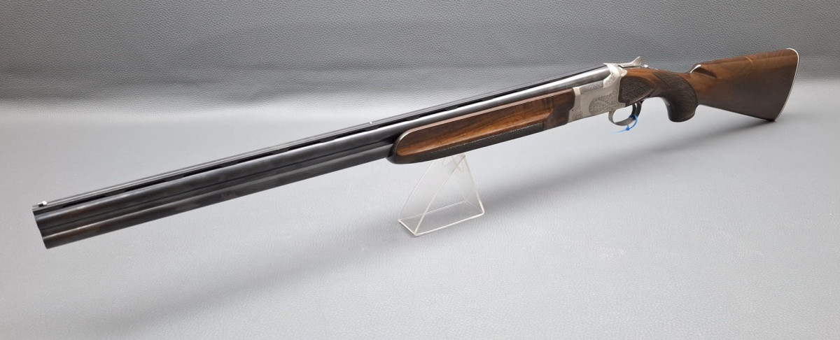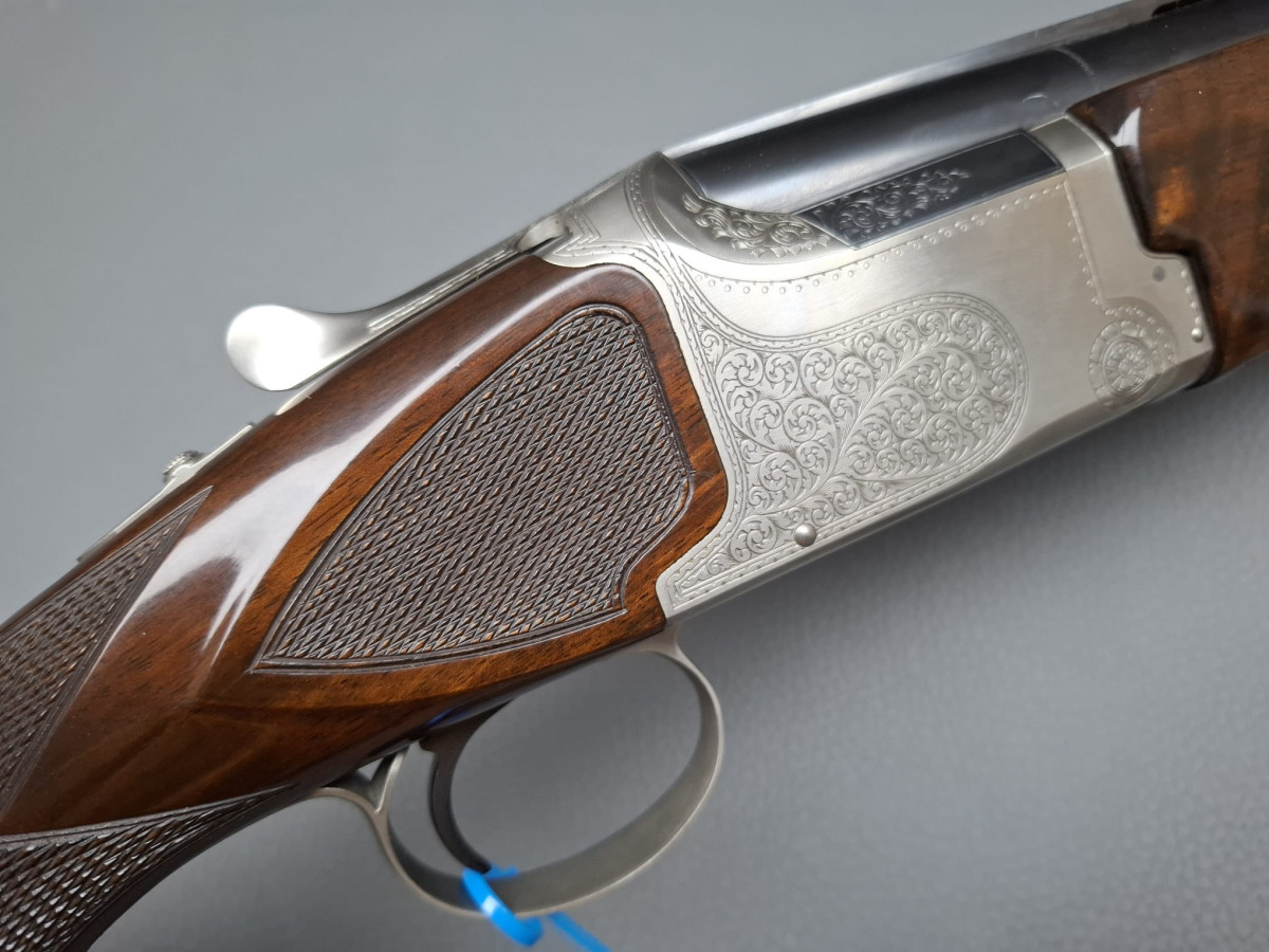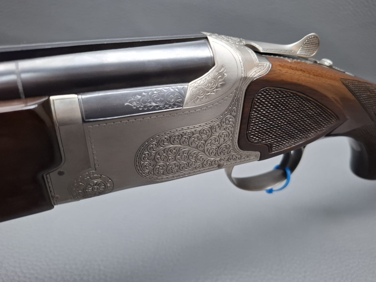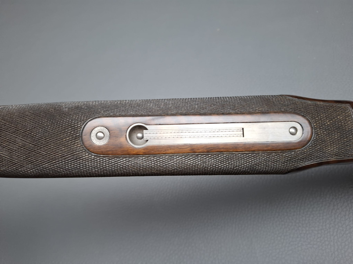 breite ventilierte Laufschiene, helles Perlkorn und Hilfskorn, Ejektoren, Einabzug mit Umschalter, Stahlabzugsbügel, Sicherungsschieber auf dem Kolbenhals. Nußbaumschaft ohne Backe und ohne Schränkung, für Rechts- und Linksschützen geeignet Läufe sehr gut, Verschluß dicht, leichte Gebrauchsspuren, Brünierung 97% Gebrauchtwaffe sehr gut